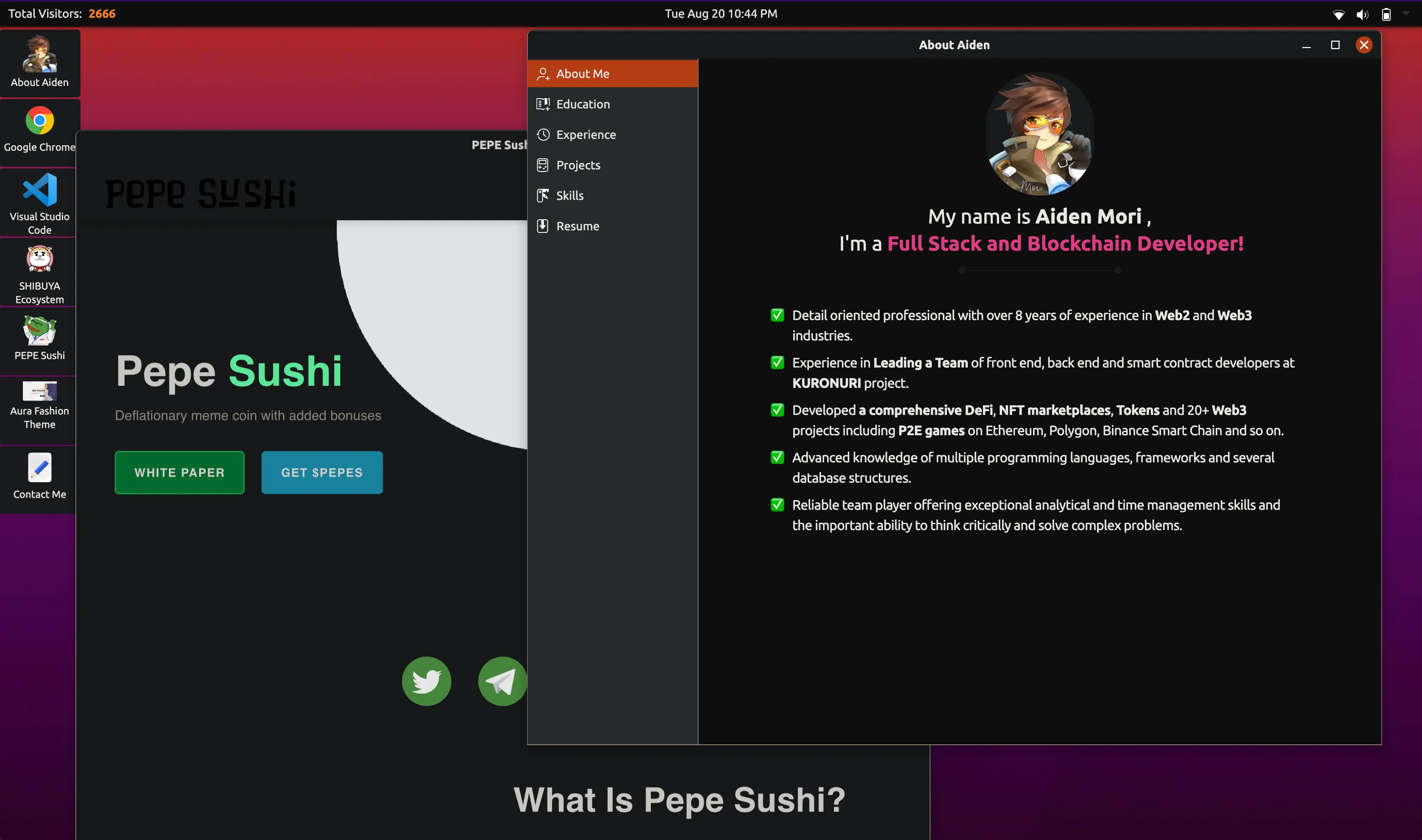 Aiden lists 52 projects on his portfolio site, including for two companies based in Australia, in the medical and real estate sectors, and a multitude of cryptocurrency projects ranging from news and media, to gaming platforms, and DeFi projects. At the time of writing, he currently sits as a cohort on a cryptocurrency media project. He appears to run the website difines[.]io which hosts several examples of his larger projects, such as FujiChat, which labels itself as an anonymous messenger application and advertises having a token listed on PancakeSwap. Aiden was also observed seeking investors for a project titled the "SHIBUYA Smart Ecosystem" that included a 79 page whitepaper. This whitepaper lists the project as planning to have features such as a decentralized crypto academy, an automated trading platform, and a freelancing app.