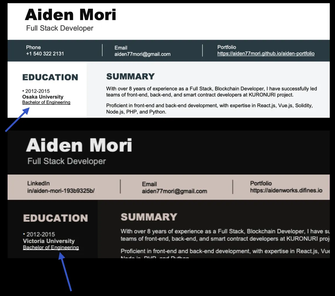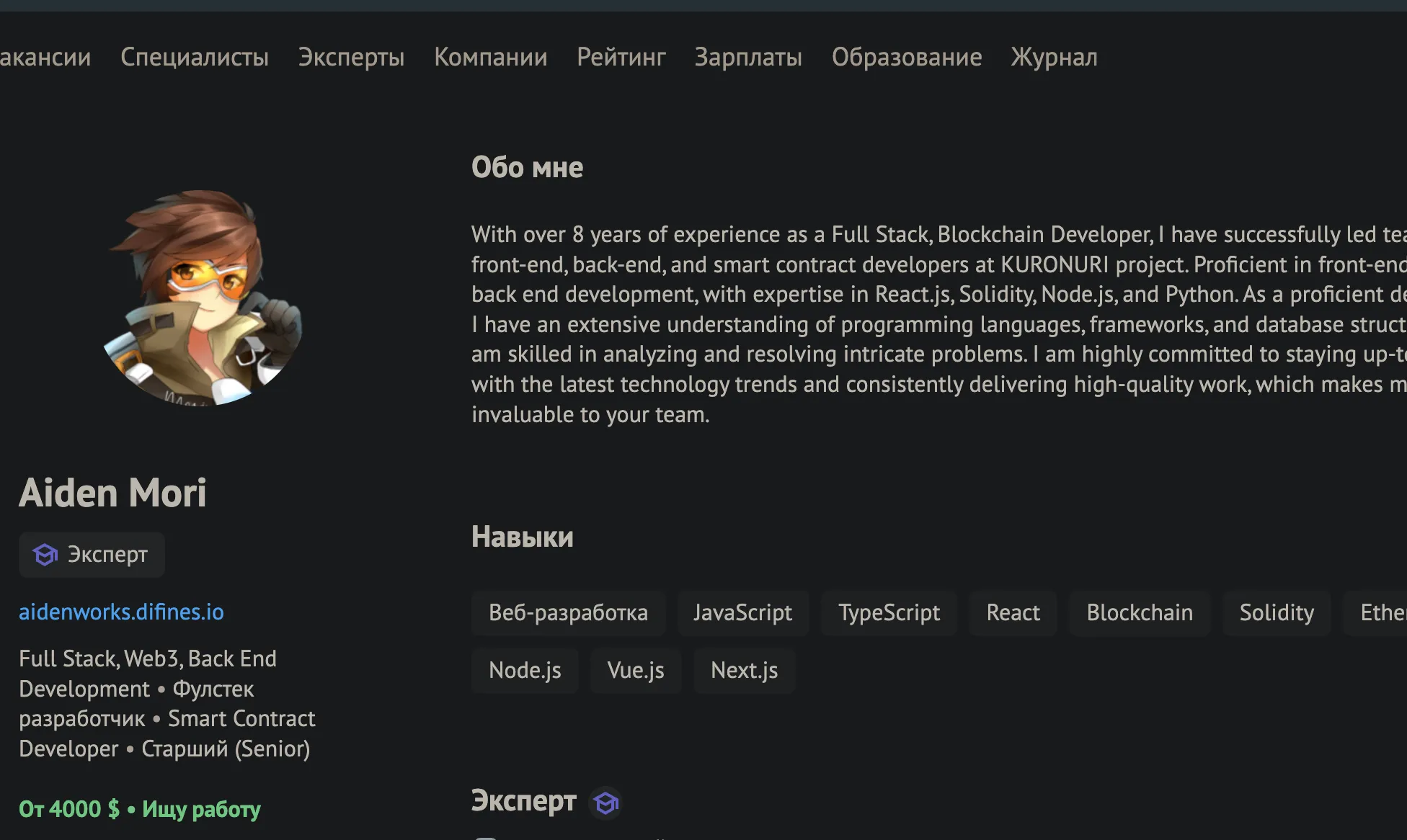 Now going by "Aiden77Mori" or "Aiden Mori", he has continued to advertise himself as a full stack and blockchain developer. His profiles all appear highly legitimate and well thought out, with a flashy portfolio site, and impressive resumes. Two versions of their resume were recovered, showing two common IT Worker indicators -- use of VOIP numbers and inconsistencies in education. One resume claimed that Aiden went to college in Tokyo while another claimed Sydney, Australia. Interestingly, Aiden also has a profile on Habr[.]ru, a Russian job marketplace where he lists smart contract development, Solidity, Web3, and Fullstack development as his areas of expertise.