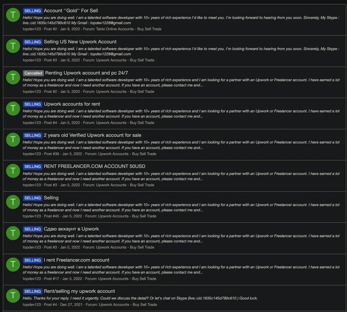 Some emails observed appeared to tie back to legitimate accounts unrelated to the IT Workers. Looking further through the data it appears that some IT Workers are active on forums such as PlayerPuff, where you can buy "aged" accounts on freelancing sites. The workers also seem aware that this activity appears suspicious -- Helios' logs contained cookie data showing that they had viewed a page on freelancer[.]com[.]ru titled: "Someone from China wants to use my Upwork account".
