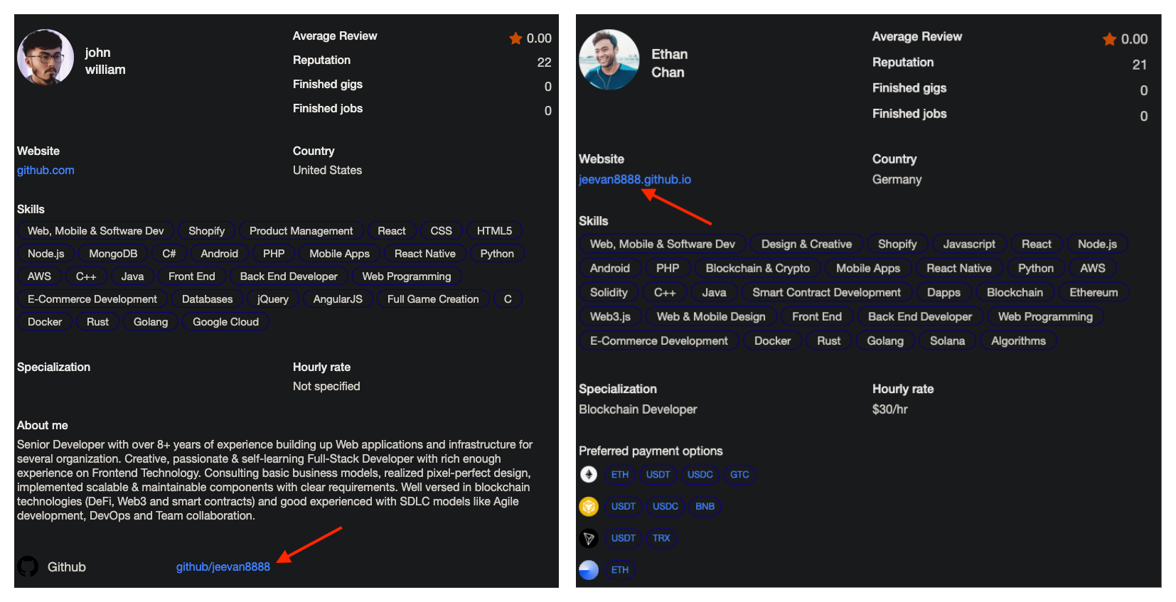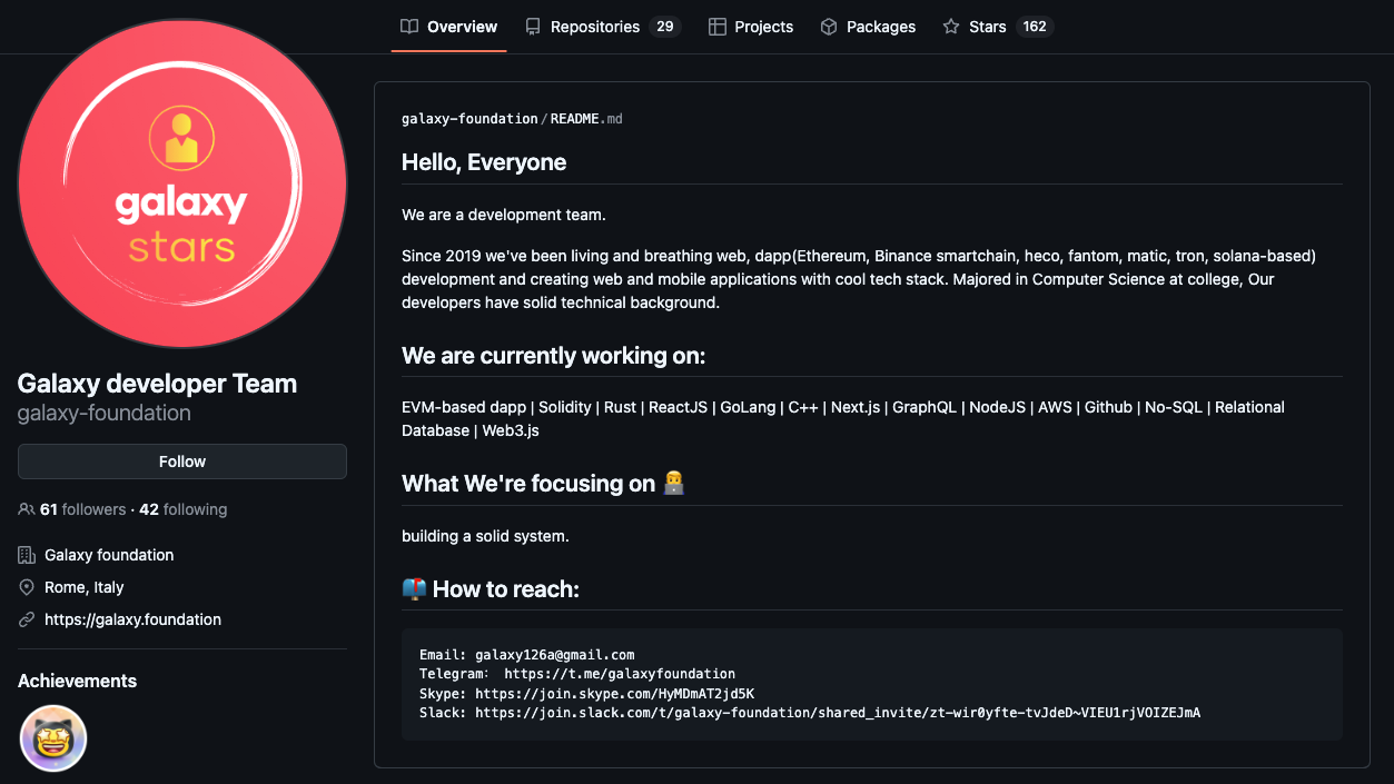 As we dug deeper, we noticed that many of these IT Workers were centered around a Github org called "Galaxy Foundation"/"Galaxy Digital" or BabylonSwap (a project associated with DefiTankLand). Although we believe that the vast majority of profiles associated with this account belong to DPRK IT Workers, we chose to only focus on a select few who shared overlaps in Github repo contents and work history. These accounts were mainly: